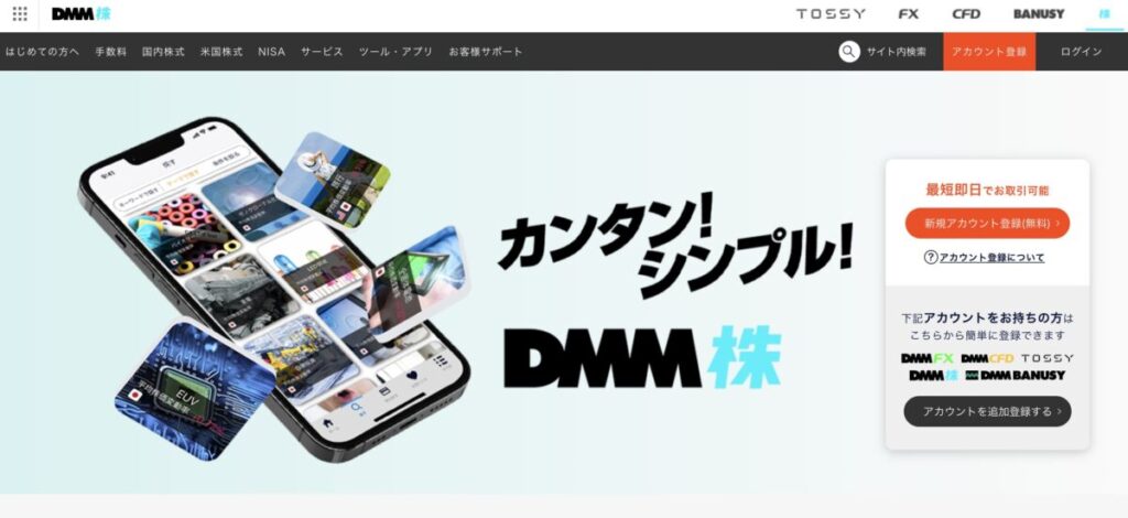 DMM株は、エンタメ企業ならではのシンプルでわかりやすいUIと、米国株取引の手数料無料が大きな特徴です。米国株の売買手数料が0ドル〜という設定は他社にはない大きなメリットで、コストを気にせず米国株投資ができます。