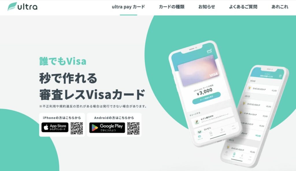 ultra payは、審査なしで誰でも持てるプリペイド式のVisaカードです。後払いサービスとして、利用実績に応じて上限額が設定され、チャージ額を後日支払えるミライバライ機能があります。