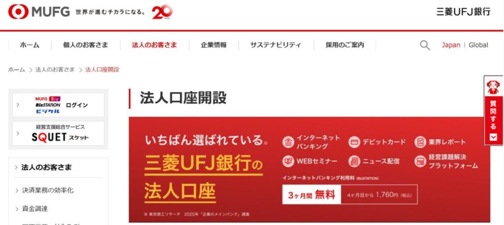 事業拡大まで見据えるなら、三菱UFJ銀行がおすすめです。振込手数料は同銀行あて振込なら無料、30,000円未満が154円、30,000円以上なら220円と標準的ですが、メガバンクならではの安心感とサポート体制が強みです。